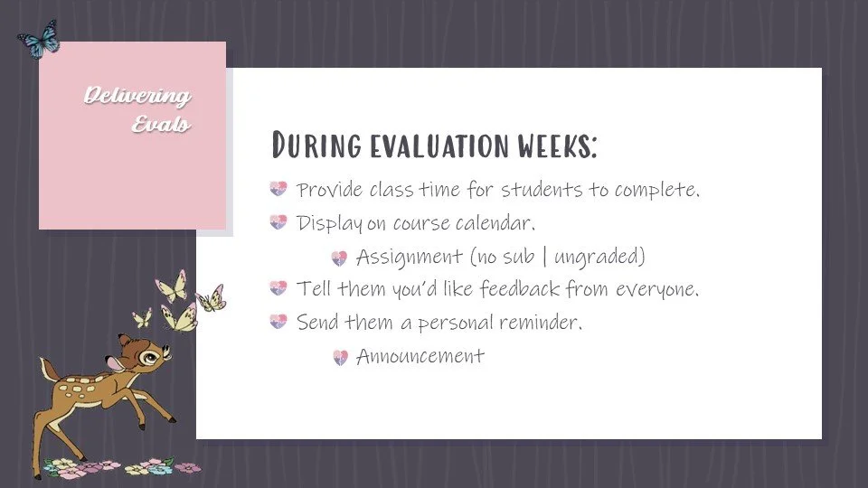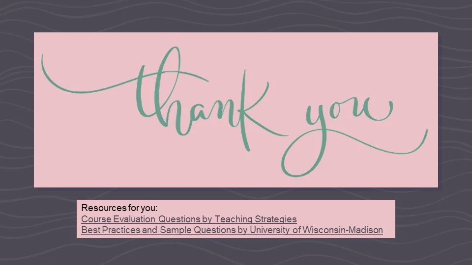 In education, the end of any semester or class run can be very stressful for university employees; especially and most importantly, faculty. In lieu of that, I pitched an idea to my team to run a series of short trainings (30mins) relevant to supporting their ‘end of semester’ needs. Since we rely so much on student feedback to improve classes, I designed this training focused on how to make the most out of your course evaluations by learning some implementation tricks, how to create your own meaningful questions, and ways to sort through your data to improve the classroom experience for both students and faculty.